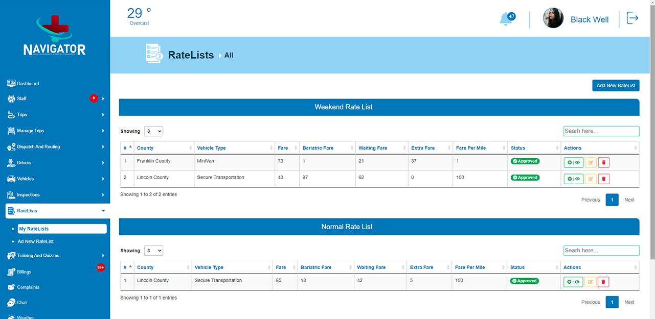 Adding Rate Lists: Click on "Add Rate List" to input your company's rate details, and save the information.